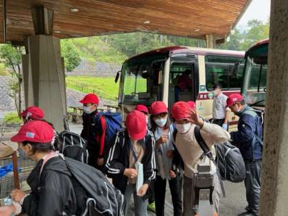 5年生を乗せたバスは、山道に揺られながらどんどん進み、山の家に到着しました。これからの活動に胸を躍らせています。