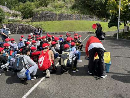 みんなの願いが届いたのか雨がやみました。記念撮影をした後、フライングディスクゴルフの時間となります。説明を聞いて、いざ出発!
