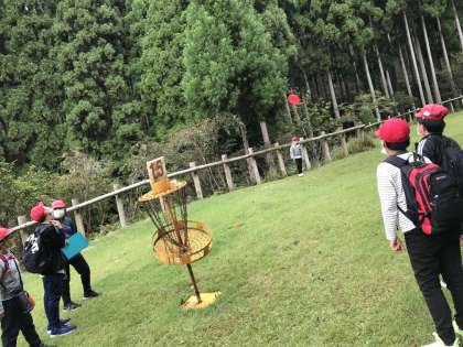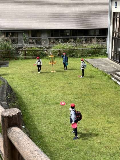 5年生の子どもたちは、フライングディスクゴルフを楽しんでいます。的をしっかりとねらってディスクを飛ばします!