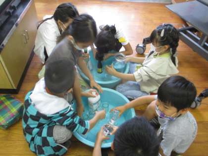 1年生の算数の学習では「おおきさくらべ」をしています。長さを比べるには?や、水の量(かさ)を比べるには?