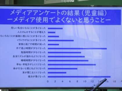 4年生になって2度目の発育測定がありました。発育測定の前に、目の健康についてクラスで学習をしました。子どもたちも使う機会が増えたメディア機器。メディア機器と付き合う中でよくないと思うことについてのアンケート結果を見ました。その中でやはり「視力が悪くなる」という意見が多いことがわかりました。目を休めながら使うこと、メディアの使用時間を決めることなど、目にとって優しい行動は何か考えを深めました。