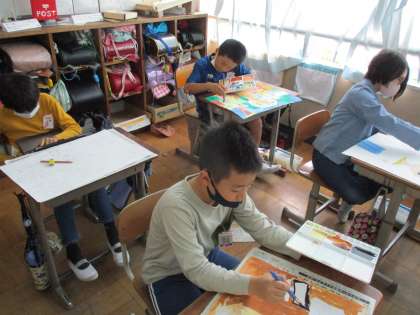 図画工作科では、お話の絵に頑張って取り組んでいます。1組と2組それぞれお話は違いますが、描きたいものを大きく描くことを意識したり、絵の具の塗り方を工夫したり、考えながら思い思いに表現しています。完成が楽しみです!