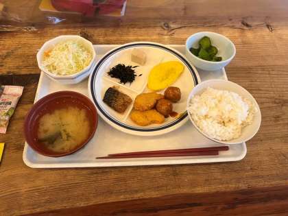 おいしそうな朝ご飯です。今日はこの後、野外炊事をします。もりもり食べて元気いっぱい活動してほしいと思います。
