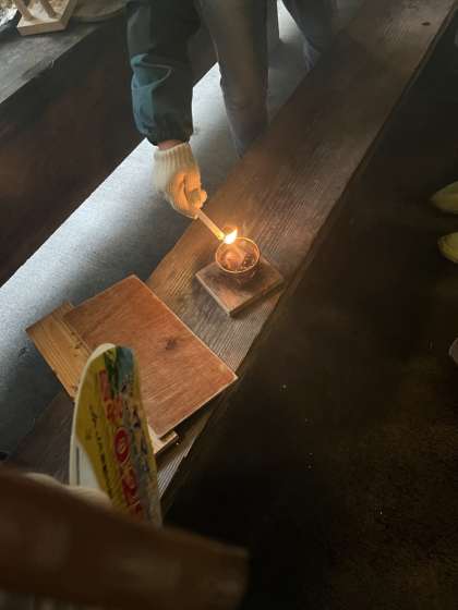 火がつきました!現在はスイッチ一つで火をつけることができますが,昔は火をつけること一つでも大変だったことがこの体験を通して実感しました。