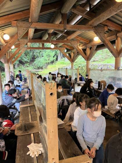 火おこし体験の後は、待ちに待った野外炊事の時間です。これから牛すき焼き風煮をつくります。まずは説明を聞いて・・・。