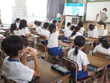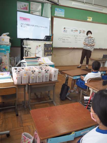 メディアの使用によって視力の低下も懸念されることを学び、「おうちの人とルールをつくること」「休憩をとること」「姿勢に気をつけること」「夜は使わない」などを確認しました。