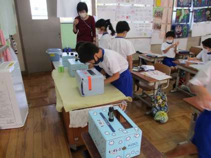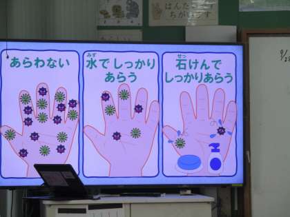 手を水であらうだけでなく、石鹸をつかったり、ハンカチでしっかりふき取ることも大切だということを教えてもらいました。