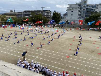 運動会最後の種目となりました。6年生の集団演技「全力魂〜みんなが☆みんなヒーロー〜」の様子です。息を合わせた演技が観ている人の感動をよびます。