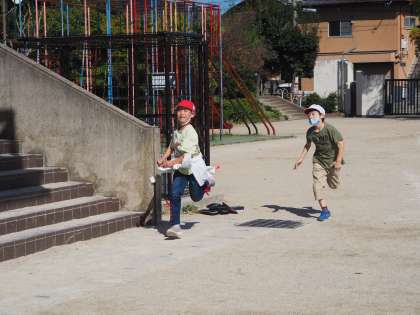 運動場、体育館、教室に分かれて、グループの1年生から6年生、みんなで一緒に遊びました。
