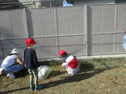 1年生の子どもたちは運動場の西側の草抜きをしました。たくさんの草を抜いて、すっきりしました。