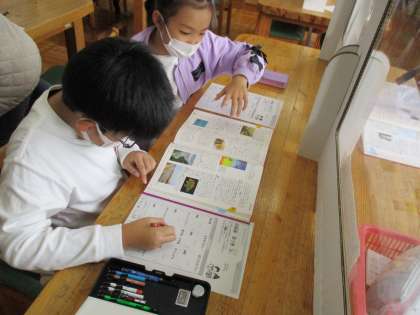 学校司書の先生と「百科事典の使い方」についての学習をしました。ポプラディアについて実際に手に取り、調べながら使い方を知りました。国語の学習で百科事典を使って調べる学習もする予定なので、これからもぜひ、図書館で手に取ってほしいと思います。