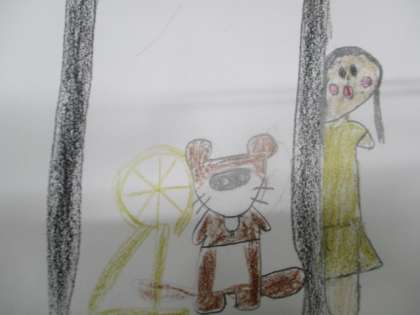 国語の学習では、「たぬきの糸車」を学習しています。この学習では、自分の好きなところを見つけて、紙芝居を作っています。教科書にはない場面を想像して描く子どもも多くいます。