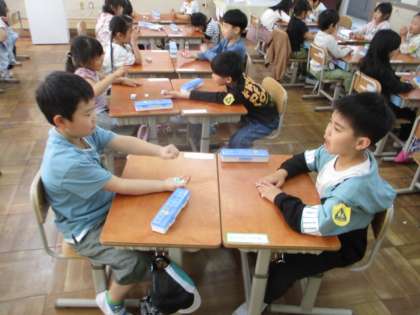 算数では「かずとすうじ」の学習をしています。今日は5の数の分解をするゲームをしました。
