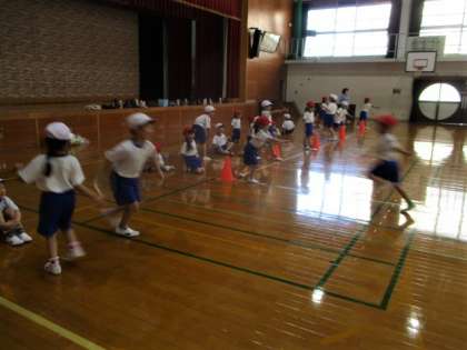 体育の学習では、リレー遊びをしています。まっすぐ走るリレーやくるんくるんリレーをしたりしました。