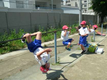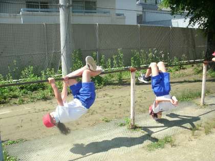 体育で「てつぼうあそび」をがんばっている2年生。鉄棒を使って、手や腹、膝で支持したり、ぶら下がったり、揺れたり、跳び上がったり、跳び下りたり、易しい回転をしたりしています。