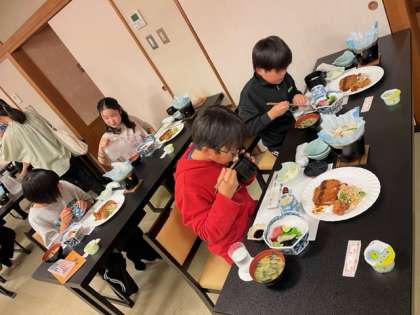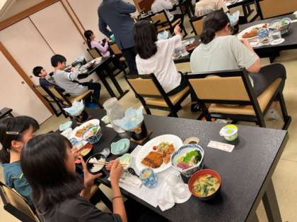 美味しい料理をお腹いっぱい食べました。夕食後は,レクリエーション、振り返りをします。
