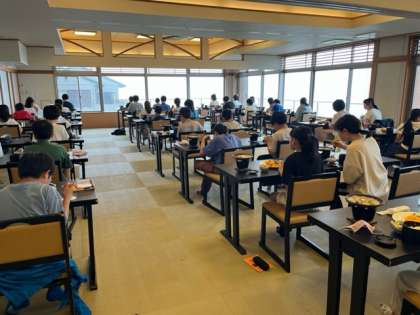 朝食を食べ、今日の活動に備えます。おいしそうな料理が並んでいます。