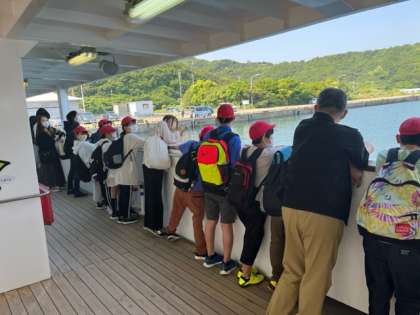 本日の一つ目の活動は、渦潮の観察です。うずしお観覧船に乗り込みます。渦潮とはどんなものなのか、わくわく、どきどきしています。