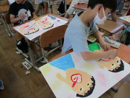 図画工作の学習では、「歯みがきをじている自分」をかいています。今日は、クレパスで色をのせました。一人で一生懸命磨いている様子や、友だちや家族と楽しそうに磨いている様子…さまざまな絵ができあがりました。完成作品は、参観で掲示します。