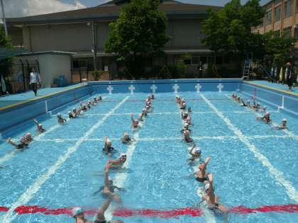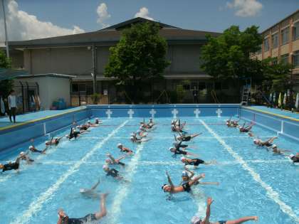 アーティスティックスイミングのまねをして、水の中で足をあげたり、ポーズをとったりしてみました。だるまうきやバタ足にも挑戦。これから、もう少し深くなっていくけれども、もっともっと水と仲良くなれるように楽しく取り組んでいきます。