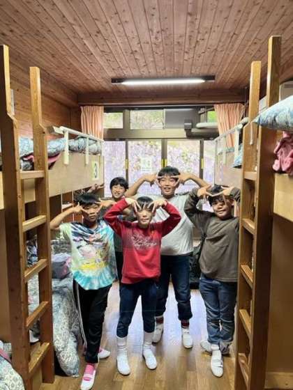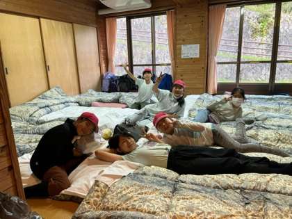 野外炊事の後、入浴と布団ひきをしています。少しほっこりとできる時間です。