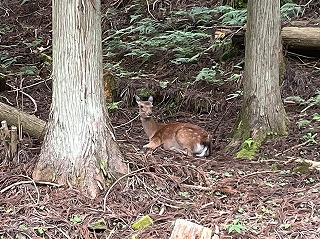 クラフトづくりの途中、またもや野生のシカが!?みんなを応援してくれているようです。