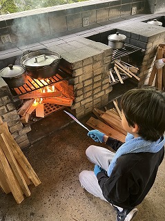 鍋を火にかけました。おいしいカレーができるように、かまど係は火の番をしています。