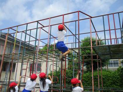 体育で「ゆうぐあそび」を頑張っています。総合遊具に安全に気を付けて挑戦をしています。「三点支持」「順手にぎり」を大切に活動をしています。