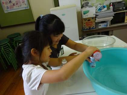 実際に容器に水を入れて、「どちらが多く入るかな?」「水が溢れたということは、こっちの方が大きいんだ!」と、班のみんなで協力しながら比べることができました。