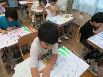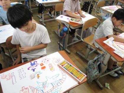 図工では、お話の絵に取り組んでいます。下絵も完成し、2年生は絵の具で背景を仕上げることにもチャレンジしました。