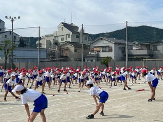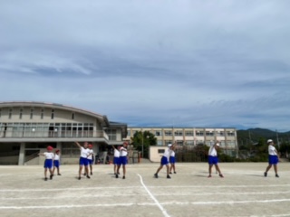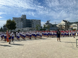 10月7日(土)に運動会を行います。全校児童が集まって開催する運動会は実に4年ぶりになります。その練習として、3日(火)に全校練習をしました。全校児童みんなが集まって練習するのも久しぶりです。とてもよいお天気の中、行進や開閉会式の練習、準備運動の練習、そして応援の練習をしました。