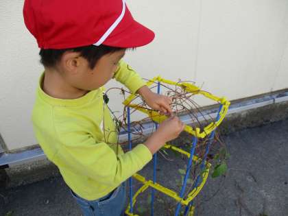 1学期から大切に育てたあさがおを使って、リースを作りました。