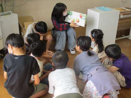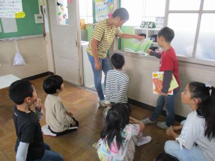 19日のにこにこなかよしタイムでは、5・6年生が下級生に絵本の読み聞かせをしました。みんなに見えるように位置を考え、感情をこめて読み聞かせをしていました。