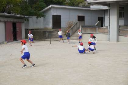 3年生では「ハンドベースボール」が始まりました。足でするキックベースボールとは違い、ティーの上に置いたボールを手で打ちます。野球と同じダイヤモンドを走り、アウト、セーフもあります。ルールも理解してきて、「今3塁に人がいるからボールは1塁の方に打とう!」など、作戦も考えて楽しむ姿が見られるようになりました。