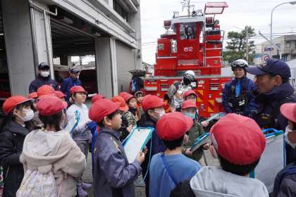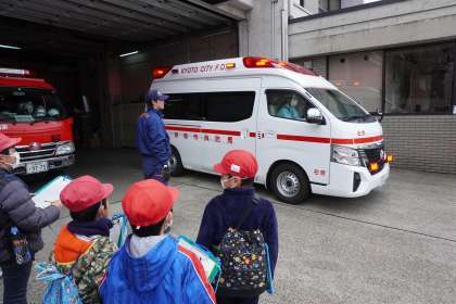 社会科の単元「火事をふせぐ」の学習の一環として、右京消防署に見学に行ってきました。消防署内の施設や設備などを見せていただき、職員の方々に分かりやすく説明していただきました。子どもたちは、「実際に火事になった時、消防士さんたちがどのように現場に出動するのか」、「消防車のはしごのひみつ」などの話に驚いたり、感心したりしながら真剣に聞いていました。