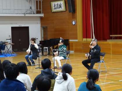 3番目は、三味線の演奏を披露していただいた「和音」さんの登場でした。昨年度までの広沢小学校の調理員さんが出演。楽しいお話とともに、素敵な演奏を聞かせていただきました。