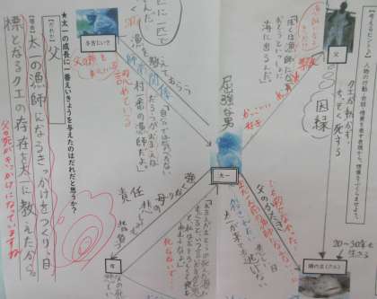6年生最後の物語文「海の命」の学習に入っています。主人公の太一とその周りの人物との関係性を探るために文章の中の会話や行動に注目しながら「人物相関図」をまとめました。一人一人の読みが違って面白い授業になりました。