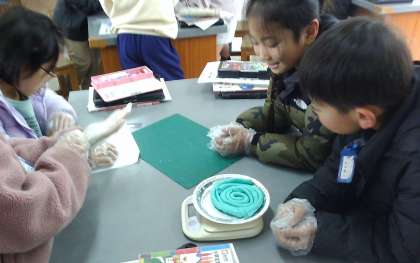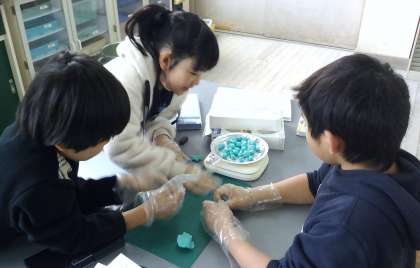 この日の授業では、「粘土の形を変えると重さは変わるか」の課題で実験をしました。グループで粘土を大きな丸にしたり、長細くしたり、小さく分けたりと変形させながら、重さを量っていきました。子どもたちは「小さく分けたら軽くなるかな?」「あれ、1グラムだけ軽くなってしまったな」と楽しみながら、ものは、形を変えても重さは変わらないことをとらえていきまいた。