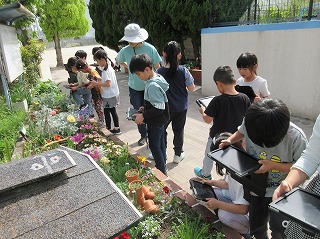 図画工作で『春』を見つけてスケッチしています。校内に咲いている花を見つけてロイロノートで写真に撮り、クレパスで思い思いに描いています。
