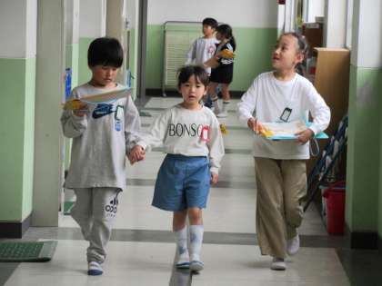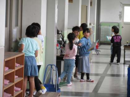 1年生に学校を案内しました。「ここは、職員室だよ。」「ここは、給食を作るところだよ。」と一生懸命説明してくれました。