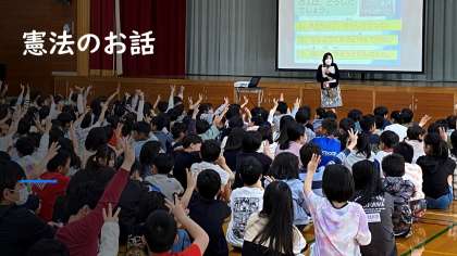 校長先生からなぜ憲法ができたのかを、クイズに答えながら学習しました。そして、「日本国憲法」とはどんなものかを、もう社会科で学習している6年生が紹介してくれました。とても分かりやすく紹介してくれ、低学年もしっかり聞いていました。