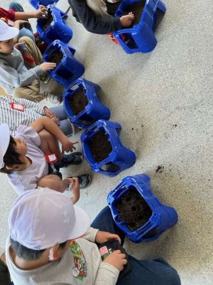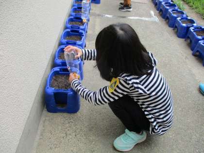 観察したあさがおの種を植木鉢に植えました。今週からは水やりのお仕事が始まりました。「早く芽が出てほしいな〜!」「明日はもう出てるんちゃう?」そんなやりとりも…。毎日水やりを頑張ってほしいです。