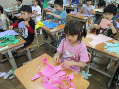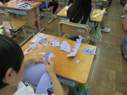 14日(火)、図画工作の学習では、いろんな形に破きました。いろんな破き方を試して、楽しみました。来週は、その破いた形が大変身します。お楽しみに♪