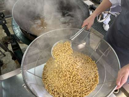 大豆は給食室でふっくら仕上がるようにじっくり煮てから、豚肉やほうれん草と一緒に炒めて仕上げました。
