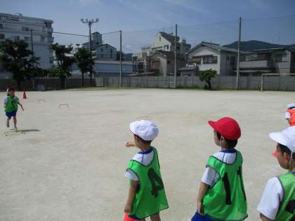 今週は、運動場にて「リレーあそび」を楽しみました。とても暑い日でしたが、水分補給をしながらリレーを楽しみました。班で「もっと腕を振ったらいいよ」「コーンを曲がるときは、大きく回りすぎないようにしよう」など、勝てるための工夫を考えて何度も勝負をしていました。