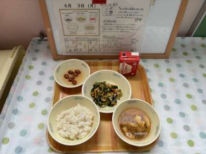 今日は6月の和(なごみ)献立の日で、麦ごはん・牛乳・豚肉と小松菜の梅いため・金時豆のあま煮・もずくのみそ汁でした。