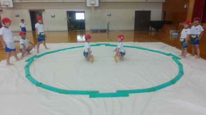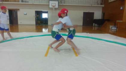 すもう学習が始まりました。まずは、まわしの付け方とルールの確認をして、実際に練習もしました。「相手の腰のところを持とう」「相手のまわしを下からつかむと持ちやすい」など楽しみながら取り組んでいます。