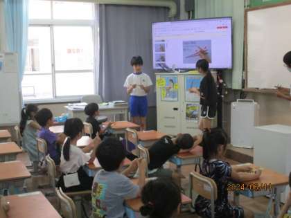 今日は、給食委員会の取り組みのひとつとして、6年生が1年生に「おはしのもちかた」を教えました。