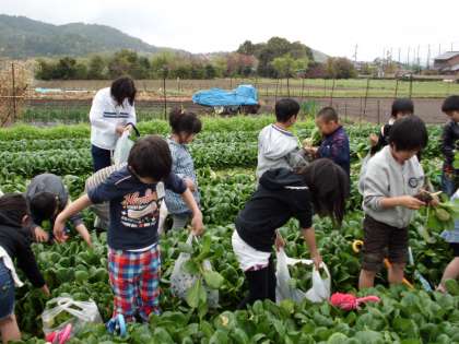 校区内にある畑に小松菜を取りに行きました。葉っぱが大きく育った小松菜を力いっぱい抜きました。どろんこになりながらも、新鮮でおいしそうな小松菜を袋いっぱい収穫し、夜ごはんの献立が楽しみな様子でした。