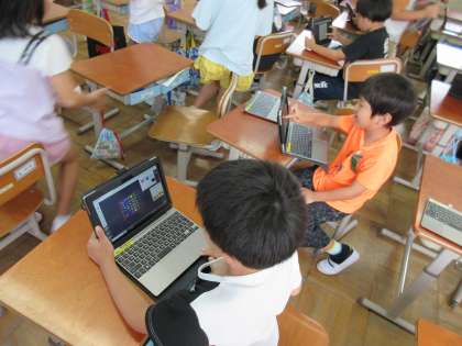 自分のほしい色や形を伝えて、ロイロノートで送りあっています。もらった形を動かして、オリジナルハロウィンカードを作っています。どんなカードになるか楽しみです。